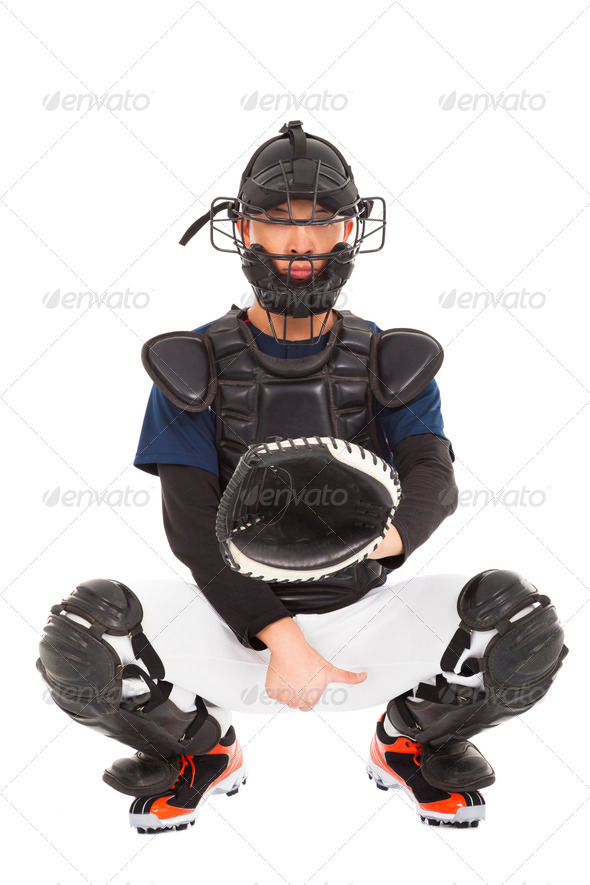 action, adult, athlete, ball, baseball, baseball cap, baseball helmet, baseball player, baseball uniform, catch, catcher, competition, confidence, crouching, equipment, finger, focused, game, glove, ground, hard, holding, isolated, male, man, mask, one, out, people, player, playing, position, professional, protection, protector, ready, sign, signal, sport, sporting, sports, sports equipment, strength, strong, studio, success, Toughness, uniform, vertical, wait