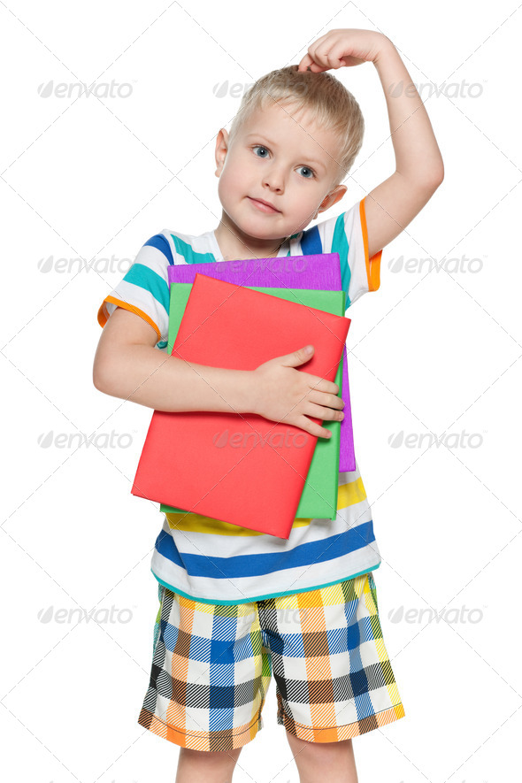 adorable, alone, book, books, boy, caucasian, cheerful, child, childhood, children, clever, confident, cut out, cute, education, Expressing, gesture, glad, handsome, hold, isolated, kid, male, one, people, person, pleasure, portrait, positive, pupil, shirt, single, smile, stand, standing, striped, student, studio, think, thought, white