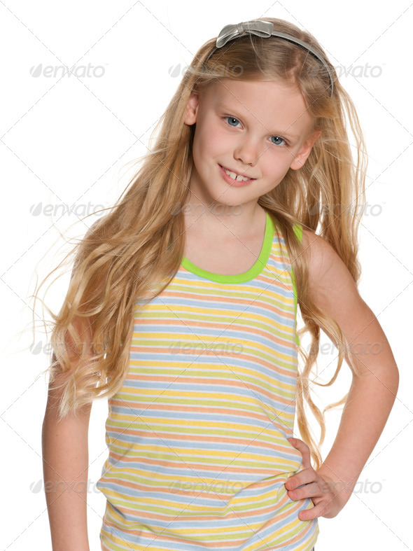 adorable, alone, beautiful, blonde, caucasian, cheerful, child, childhood, close-up, closeup, cut out, cute, emotion, enjoyment, european, fashion, front, girl, hair, happiness, happy, indoor, isolated, joy, kid, lovely, nordic, one, people, person, pleasure, portrait, positive, positivity, pretty, single, smile, stand, striped, studio, white, young