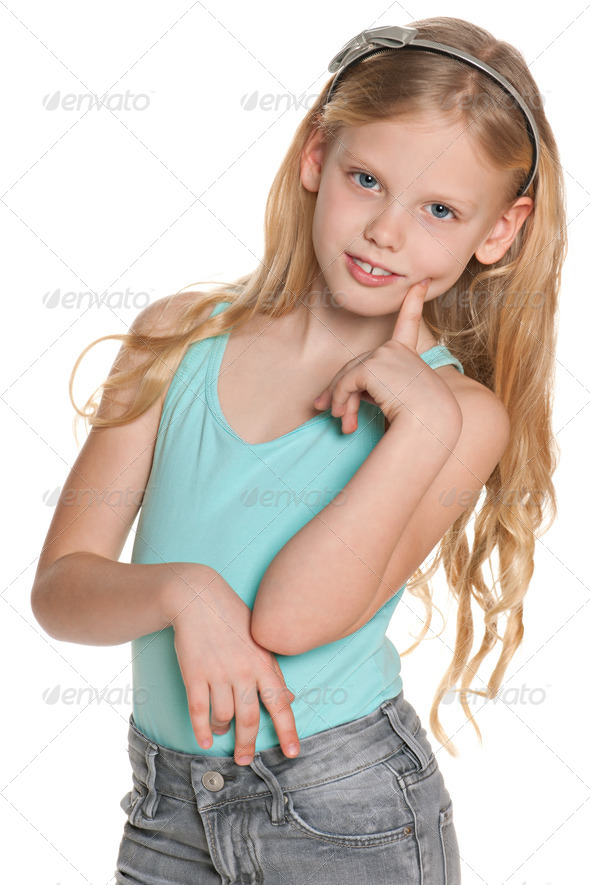 adorable, alone, beautiful, blonde, blue, caucasian, child, childhood, close-up, closeup, concentration, cut out, emotion, enjoyment, european, fashion, finger, focused, front, gesture, girl, hair, imagination, indoor, isolated, kid, lovely, nordic, one, pensive, people, person, pleasure, portrait, positive, positivity, pretty, question, scandinavian, single, smile, stand, studio, think, thought, white, young