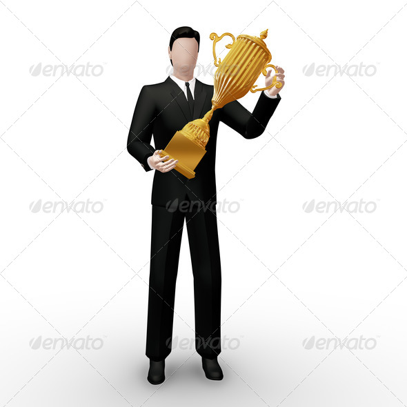 3d, abstract, accolade, achievement, award, businessman, competition, cup, first, gold, man, people, premium, rank, success, suit, trophy, white, winner