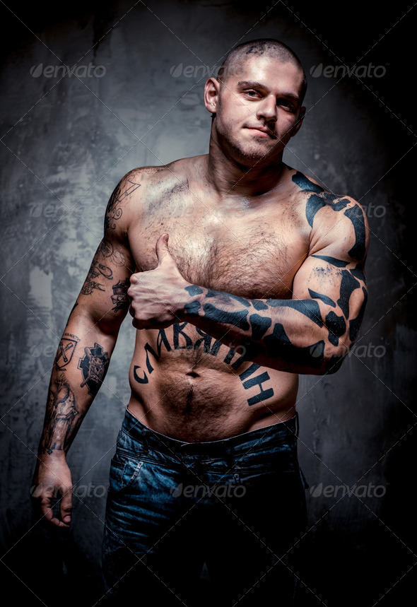 abs, adult, alone, arms, athlete, athletic, attractive, beauty, body, bodybuilder, bodybuilding, caucasian, chest, criminal, figure, fit, fitness, gesticulate, gesture, guy, hands, handsome, human, jeans, male, man, masculinity, model, muscle, muscular, naked, one, person, physical, power, sexuality, sexy, shape, shoulders, sport, sportive, sportsmen, strength, strong, studio, tattoo, thumb up, torso, weight, young
