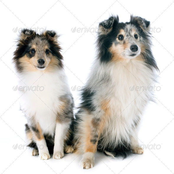 adult, animal, black, collie, dog, dogs, indoors, little, merle, pedigree, pet, puppy, purebred, sheepdog, shetland, shetland dog, studio, tricolor, two, white, white background, young