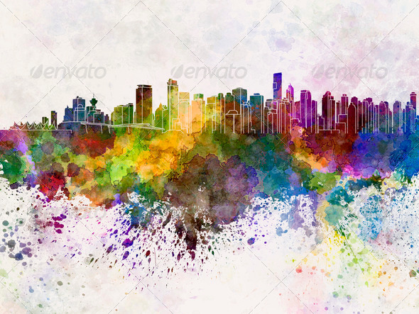 abstract, architecture, art, background, bright, british columbia, canada, cityscape, color, colorful, creativity, grunge, illustration, ink, landmark, monuments, north america, paint, panoramic, paper, skyline, splash, splatter, texture, vancouver, Vancouver skyline, vintage, watercolor