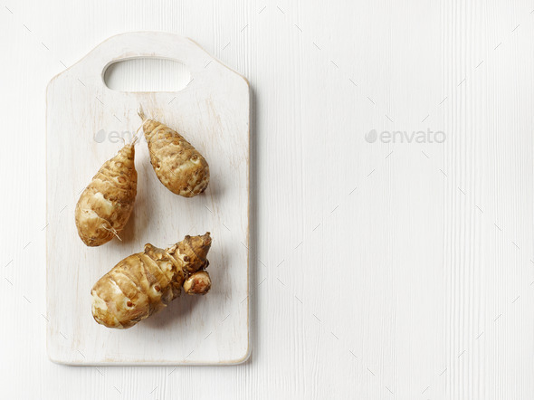 antioxidant, background, cooking, copy space, cutting board, food, harvest, health, healthy, ingredient, Jerusalem artichoke, nobody, raw, root, still-life, Studio Shot, table, texture, top view, topinambour, vegan, vegetable, vegetarian, white, whole, wood, wooden