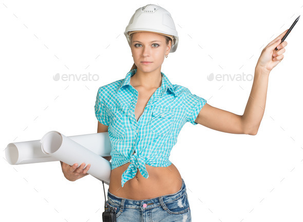 adult, antenna, at camera, ballpoint pen, beautiful, blonde, body, builder, caucasian, female, front, girl, handyman, hardhat, helmet, holding, indicates, isolated, jeans, lady, looking, paper, pen, professional, protective, right, scroll, sexy, shirt, shorts, standing, walkie-talkie, woman, worker, young