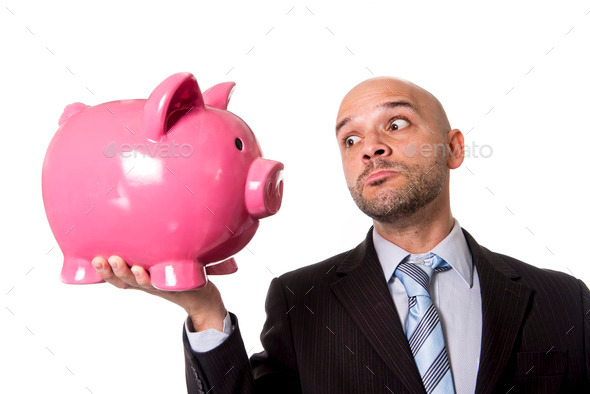 bald, bank, banking, businessman, cash, ceramic, collected, concept, currency, economy, expression, face, face to face, finance, financial, full, funny, hand, hold, humor, invest, investment, isolated, loan, looking in the eye, man, money, necktie, person, piggy, piggy-bank, piggybank, pink, rich, save, saving, savings, security, success, suit, tie, treasure, wealth, white