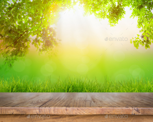 Fresh spring green grass and wood floor with green leaf , Summer (Misc) Photo Download