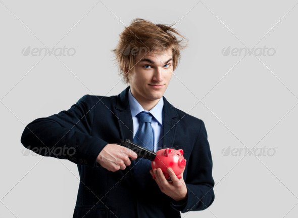 background, bank, banking, bankruptcy, box, businessman, cash, caucasian, coldness, collect, concept, container, crazy, crime, crisis, currency, economy, finance, financial, fund, funny, grey, grimace, gun, handsome, hold, indifference, invest, investment, kill, man, money, moneybox, object, one, people, pig, piggy, piggybank, rich, safe, save, savings, shoot, suit, toy, unconcern, wealth, weapon, young