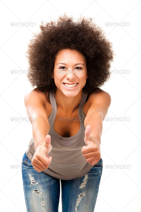 adult, african, afroamerican, american, attractive, background, beautiful, beauty, black, brunette, casual, confident, emotion, ethnic, expression, expressive, face, female, fresh, friendly, fun, gesture, girl, gorgeous, happiness, happy, isolated, looking, model, natural, ok, okay, one, optimistic, people, portrait, pretty, satisfied, smile, smiling, studio, success, thumbs, up, white, woman, young