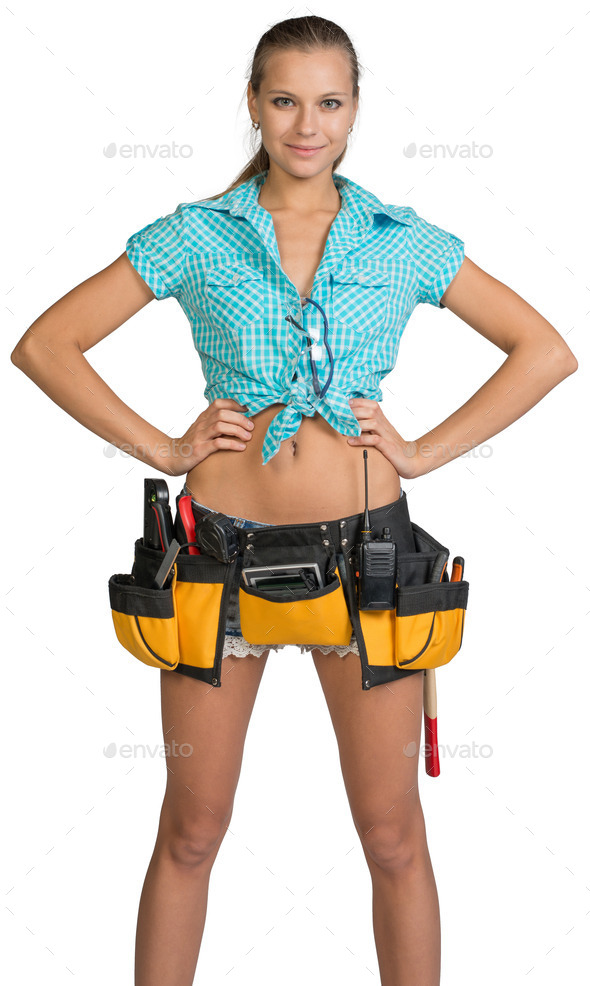adult, antenna, at camera, beautiful, belly button, blonde, body, builder, building level, calculator, calipers, caucasian, female, front, girl, goggles, hammer, hand tool, handle, handyman, holding, in pocket, isolated, jeans, knot, lace, lady, looking, orange, pencil, pliers, pocket, posing, professional, scissors, sexy, shirt, shorts, smile, smiling, standing, tape-measure, tool, tool belt, waist bag, walkie-talkie, woman, worker, young