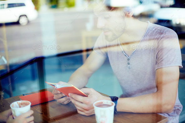 adult, boyfriend, cafe, calm, casual, caucasian, coffee, drink, glass, handsome, indoor, lunch, man, masculine, note, notebook, person, reading, reflection, sitting, table, transparent, unshaven, window, young