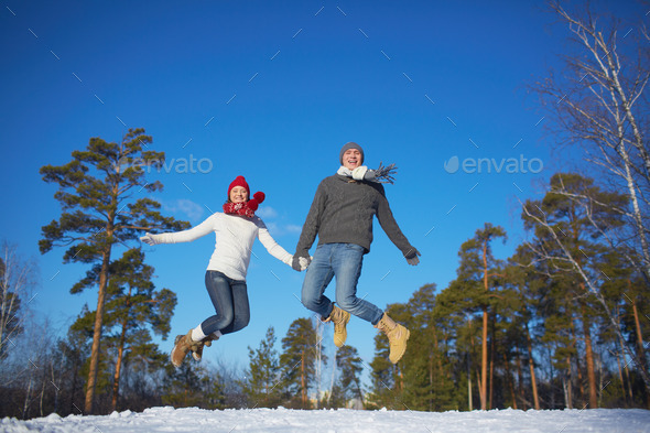 adult, amorous, boyfriend, casual, couple, dating, dynamic, environment, forest, girlfriend, happy, jumping, lifestyle, love, man, outside, park, people, relationship, romance, smiling, sweethearts, winter, woman, young