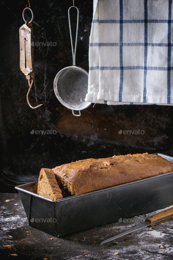 baked, bakery, baking, black, bread, breakfast, brown, cake, cooking, dark, dough, eating, flour, food, fresh, freshly, grain, health, healthy, home, homemade, kitchen, knife, loaf, pan, pans, rural, rustic, rye, seed, sourdough, stainer, table, tin, towel, wheat, wood, wooden