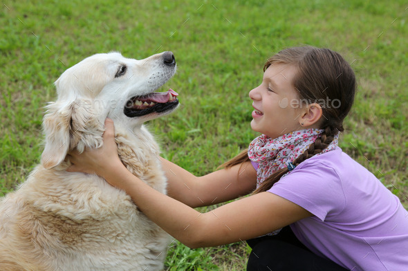 animal, child, childhood, children, cute, dog, dogs, embracing, friend, friends, friendship, fun, girl, golden retriever, happiness, happy, joy, kid, labrador, little, love, meadow, outdoor, outdoors, outside, park, people, pet, pets, play, playing, young