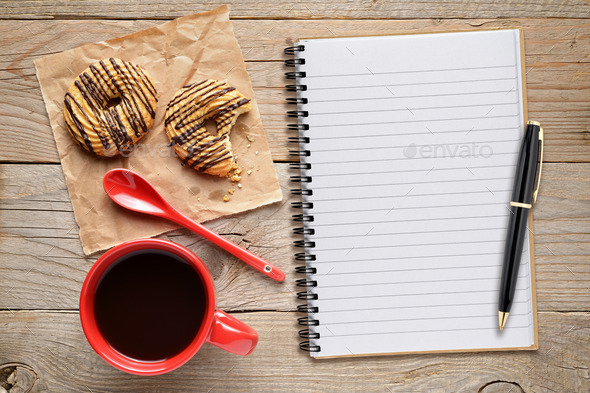 beverage, blank, book, breakfast, coffee, cookies, copybook, cup, delicious, dessert, drink, food, morning, mug, note, notebook, notepad, pad, paper, pen, red, spoon, sweet, table, tasty, top view, wood, wooden, writing pad