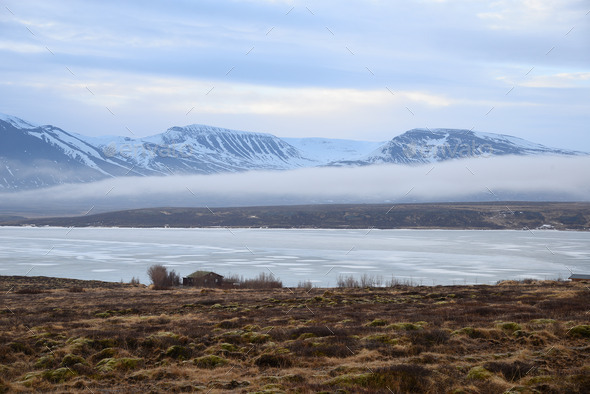cloudy, field, fog, gloom, grass, grey, iceland, lake, layer, mist, mountain, peninsula, sea, snow, thin