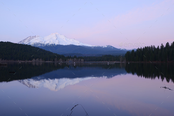 california, capped, dusk, evening, famous, lake, mount, mountain, northern, park, peak, reflection, reservior, shasta, snow, sunset, usa, view, water, winter