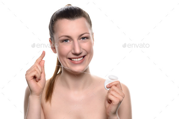 at camera, attractive, care, caries, cleaning, container, cute, decay, dental, dentition, face, female, floss, flossing, hands, happy, health, healthcare, healthy, holding, hygiene, isolated, lifestyle, medical, naked, on white, oral, pretty, skin toned, smile, smiling, teeth, tooth, top, woman, young
