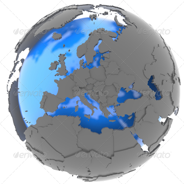 3d, blue, borders, continent, countries, earth, europe, european, global, globe, graphic, grey, illustration, international, isolated, isolated on white, map, model, north africa, planet, shadow, sphere, standing out, western asia, world