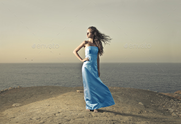 beach, beautiful, beauty, bird, blue, dress, elegance, fashion, girl, landscaped, look, outdoor, sea, seaside, sky, summer, travel, view, walk, wind, woman, young