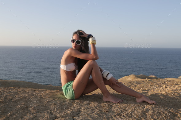 beach, body, deck, deckchair, fashion, girl, isolated, landscaped, nature, outdoor, relax, rock, sea, sitting, sleep, stone, summer, swimsuit, toning, wave, woman, young, youth