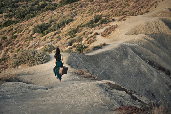 alone, back, desert, distance, explore, far, fashion, hill, landscaped, lonely, mountain, nature, old, outdoor, plant, street, suitcase, travel, trip, vintage, voyage, walk, way, woman