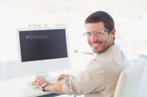 30s, bureau, business casual, businessman, caucasian, cheerful, computer, computer monitor, corporate, desk, electronic, glasses, happy, indoors, keyboard, male, man, Mid Adult, mouse, office, pc, screen, sitting, smiling, swivel chair, technology, typing, using, workplace